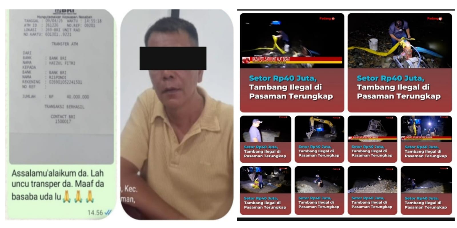 Ia diminta menyetor uang sebesar Rp100 juta per unit alat berat sebagai “uang payung”, dengan iming-iming jaminan keamanan dari aparat. “RSP” disebut-sebut mengklaim memiliki kedekatan dengan pejabat penting di lingkungan Polda Sumatera Barat, yang akan memastikan aktivitas tersebut aman dari penindakan hukum.