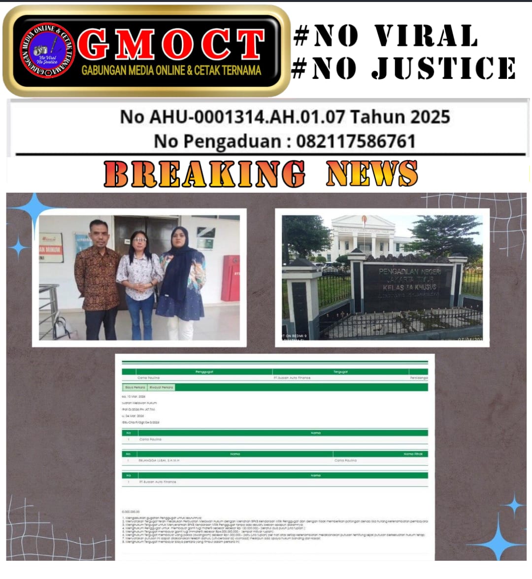 • Ganti Rugi Materiil: Sebesar Rp120.000.000, akibat kehilangan potensi ekonomi dari kendaraan yang BPKB-nya ditahan.